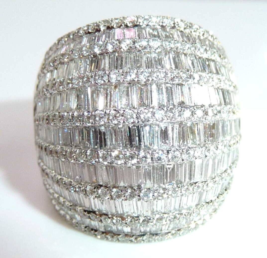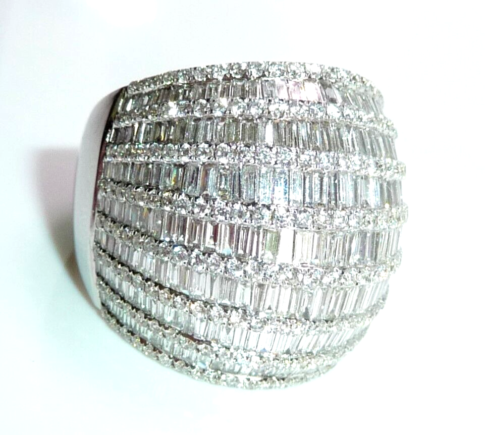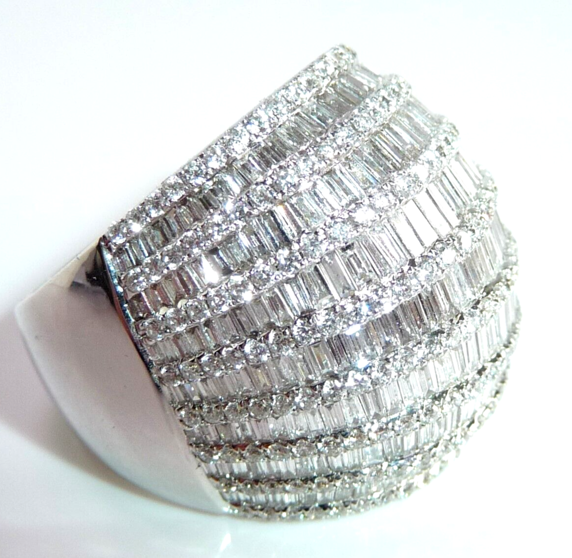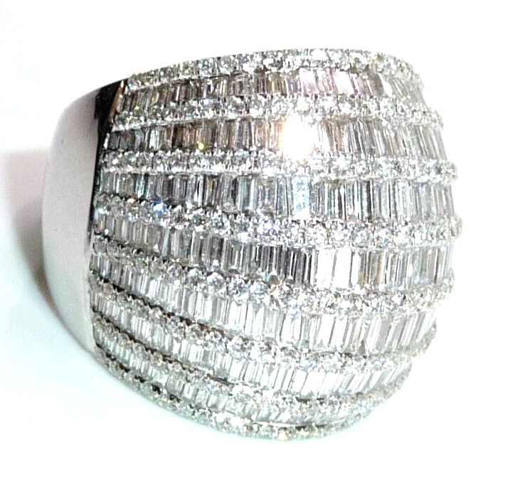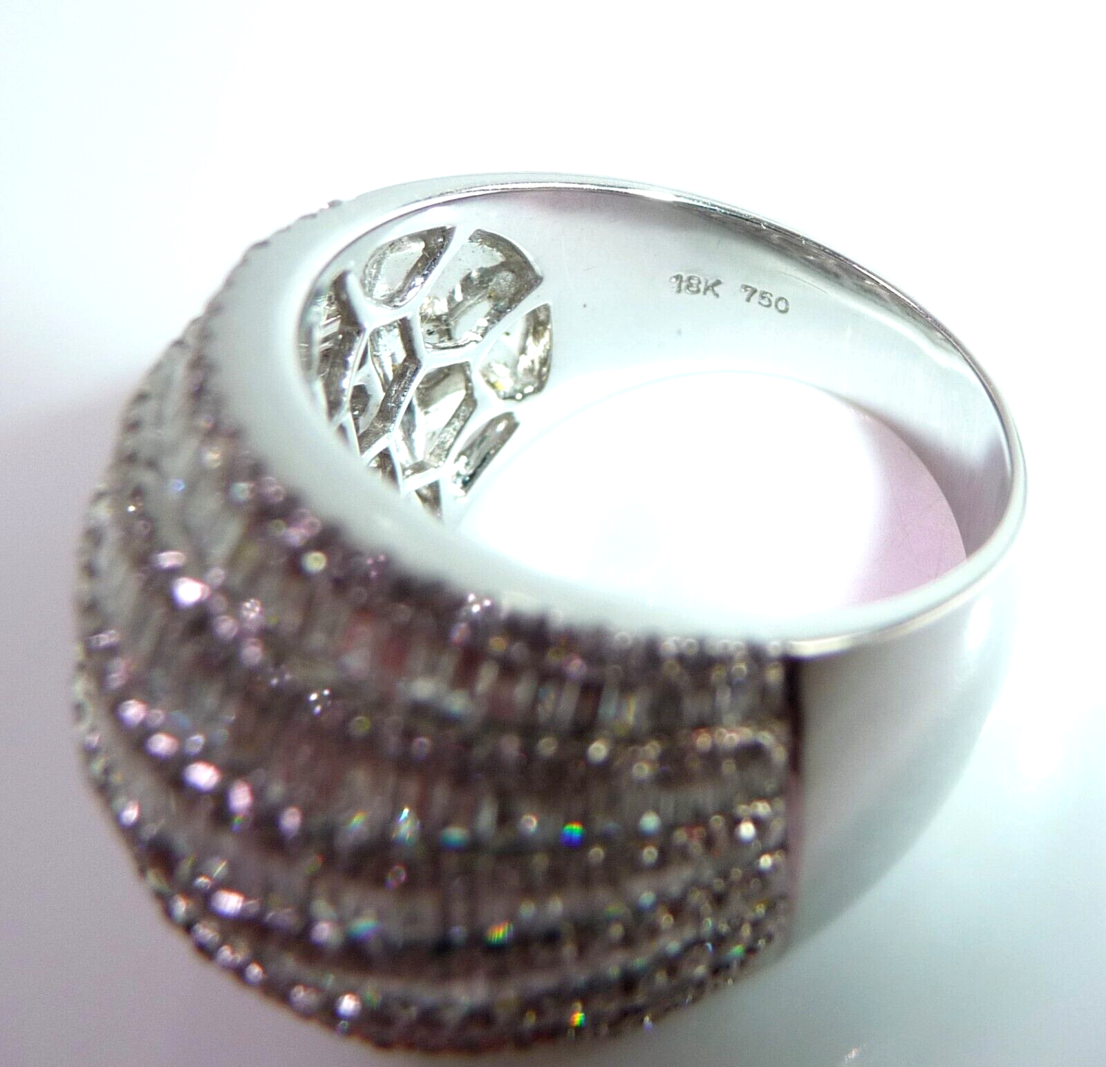 Hochwertiger Cocktail-Ring in 18 K / 750 Weißgold. Der sehr breite und opulente Bandring ist mit ungefähr 466-470 Diamanten von total mindestens 6.00 ct. bestückt. Davon sind etwa 260 Diamanten im Baguette-Schliff in 7 parallelen Reihen dicht an dicht in Kanal-Fassungen (invisible setting) eingefasst. Da sich der Ring zur Mitte hin wölbt, werden die 260 Baguette-Diamanten zur Mitte hin etwas größer. Wir haben sie dennoch nur mit 5.00 ct. berechnet.