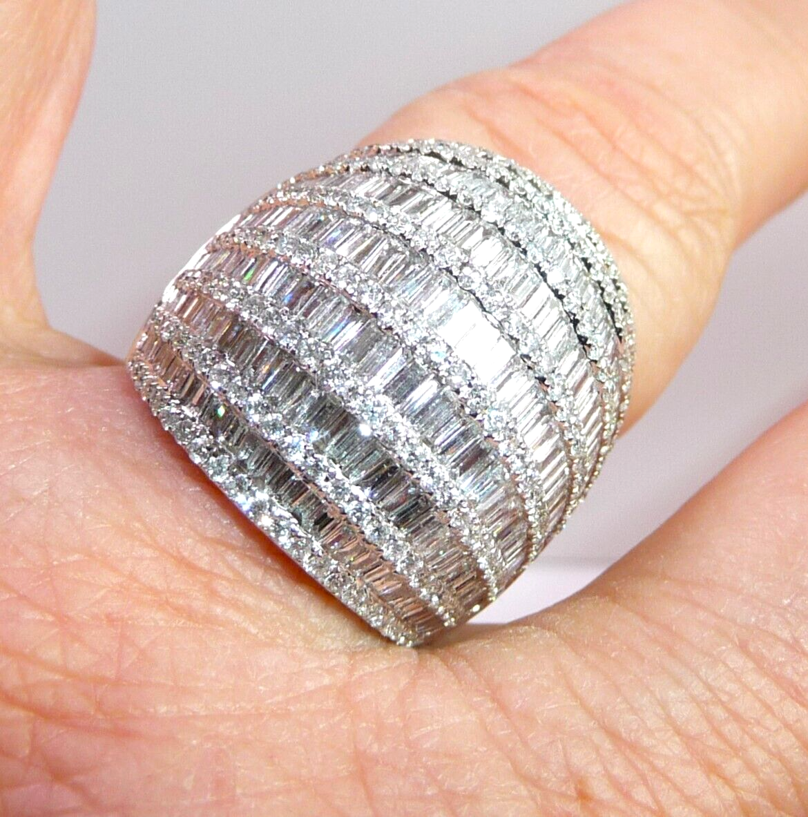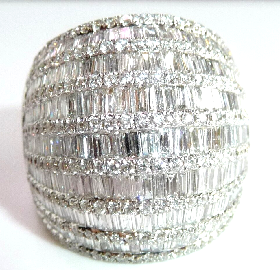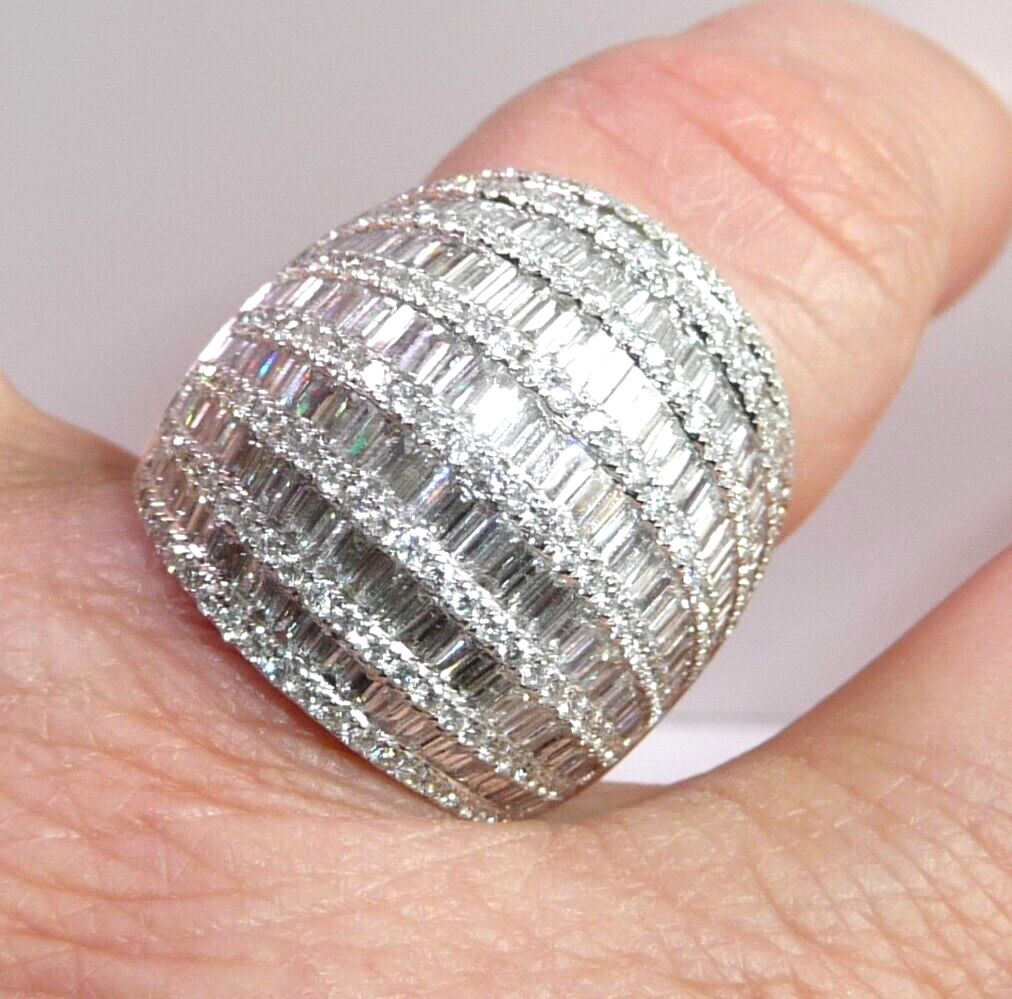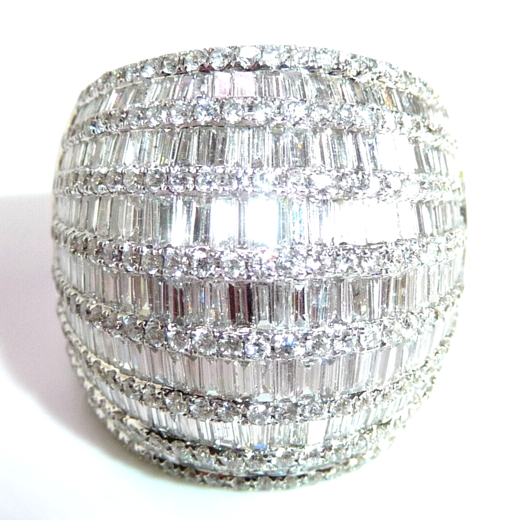 Hochwertiger Cocktail-Ring in 18 K / 750 Weißgold. Der sehr breite und opulente Bandring ist mit ungefähr 466-470 Diamanten von total mindestens 6.00 ct. bestückt. Davon sind etwa 260 Diamanten im Baguette-Schliff in 7 parallelen Reihen dicht an dicht in Kanal-Fassungen (invisible setting) eingefasst. Da sich der Ring zur Mitte hin wölbt, werden die 260 Baguette-Diamanten zur Mitte hin etwas größer. Wir haben sie dennoch nur mit 5.00 ct. berechnet.