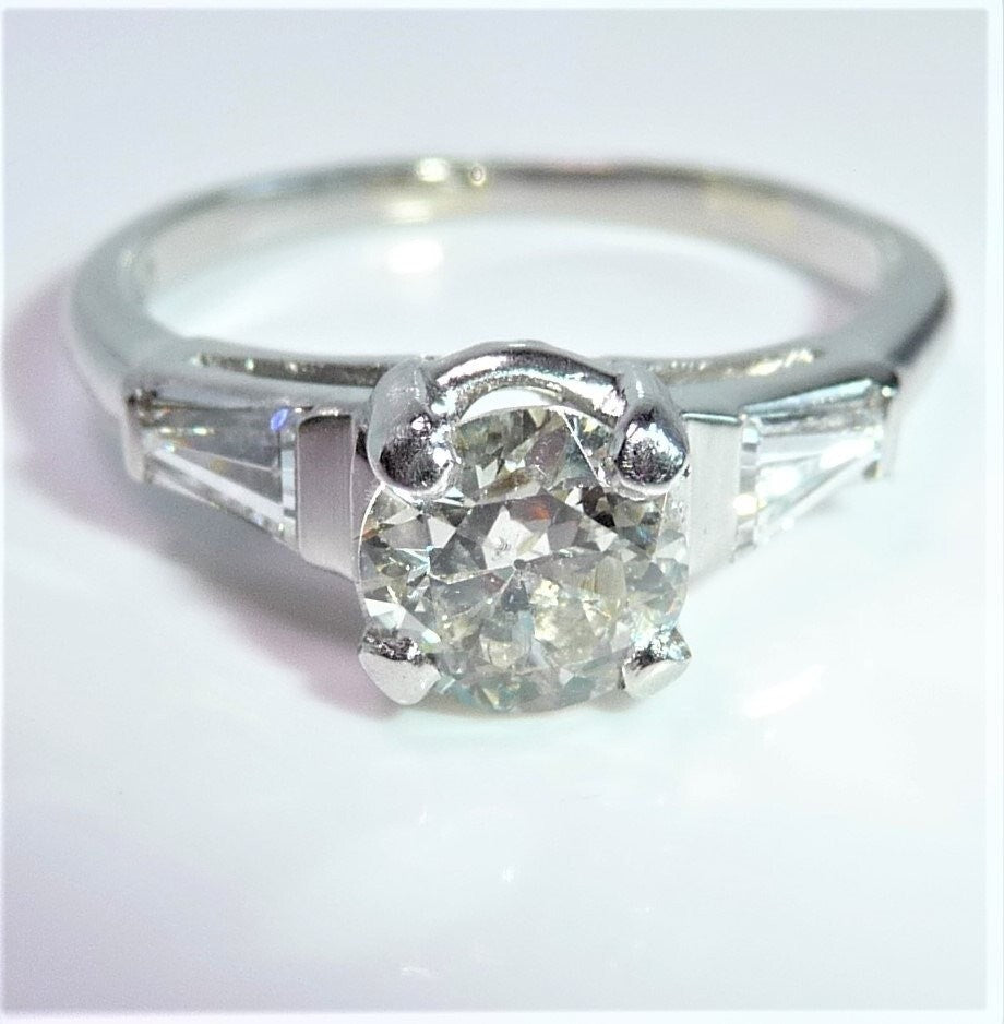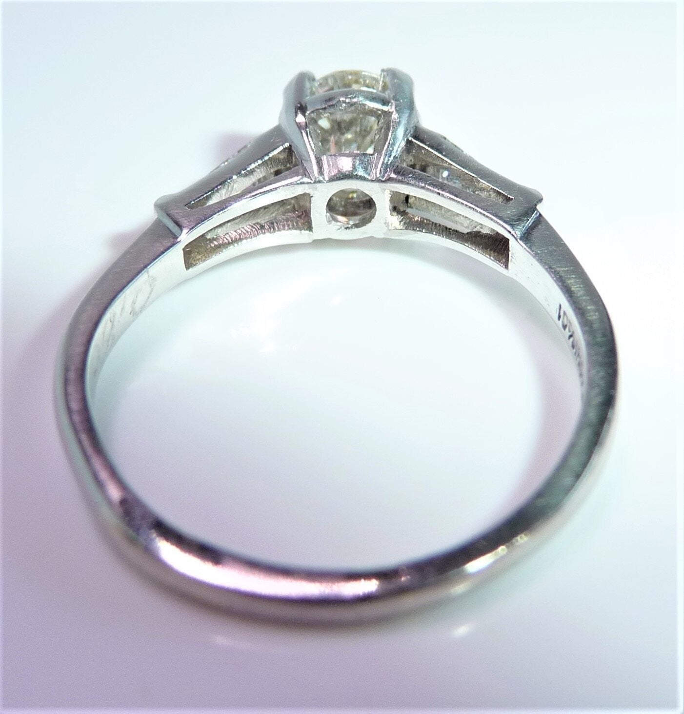 Solitär-Diamant Ring mit Diamant-Akzenten auf den Ringschultern. Gearbeitet in 900 Platin (900/1000) mit 10% Iridium (100/1000).