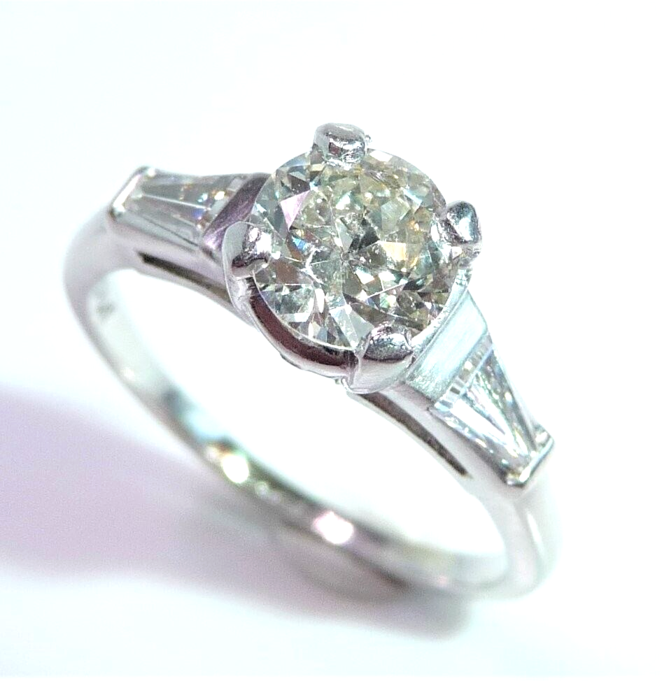 Der Solitär-Ring hat einen Diamanten im antiken Brillantschliff von 0.86 ct. eingefasst. Der zentrale Diamant hat einen Durchmesser von 6,3 mm und eine Tiefe von 3,5 mm. Der große Diamant ist leicht getöntes Weiß und entspricht damit etwa Farbe I und Reinheit SI-P1. Das Karat-Gewicht in in der Ringschiene eingraviert mit 0.86.