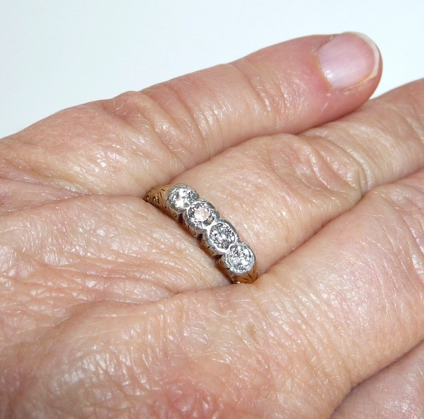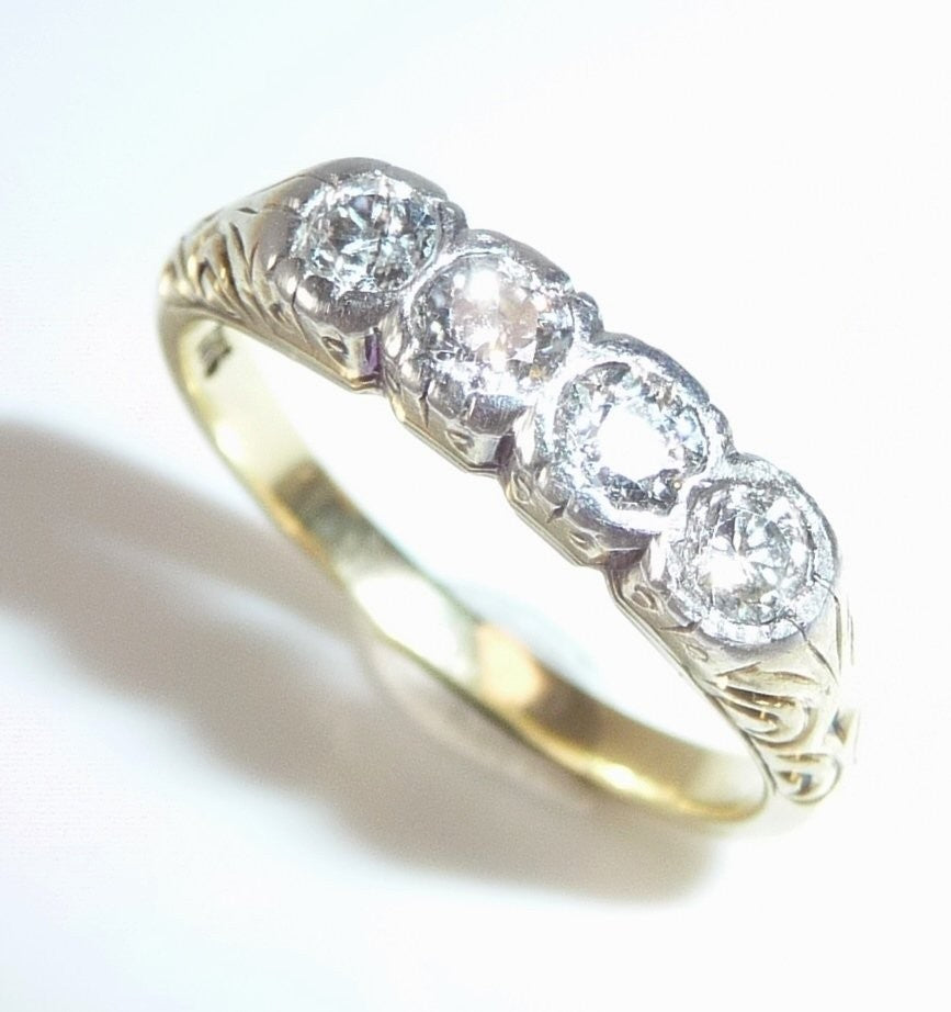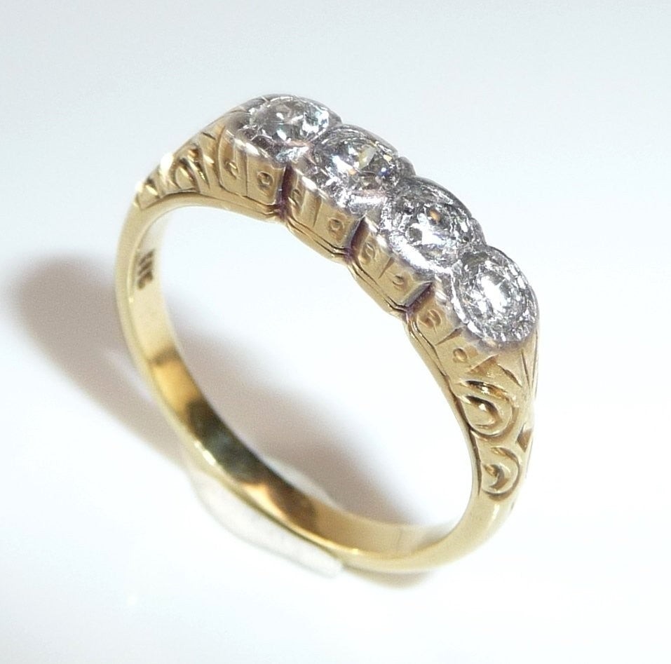 Antiker Ring, gearbeitet in 14 K / 585 Gelbgold. Das Design ist quer zum Finger arrangiert und verzaubert mit seitlichen Ornamenten im Ringkopf. Die 4 Diamanten sind in eine Schicht Weißgold oder Platin eingefasst. Die Diamanten sind im Antiken europäischen Schliff und sind alle identisch groß. Farbe ist ein helles Weiß (F-G), was man sofort an dem brillanten Funkeln sehen kann. Reinheit liegt bei durchschnittlich VS-SI.