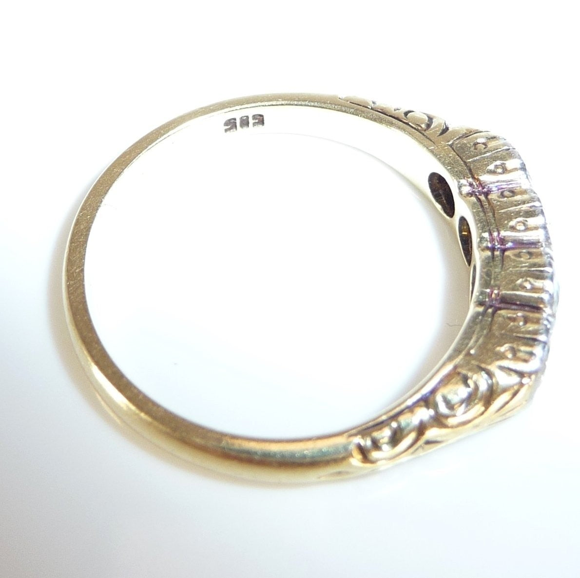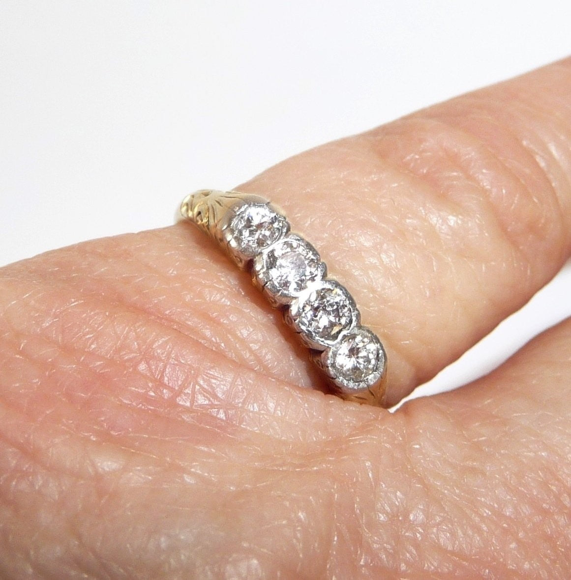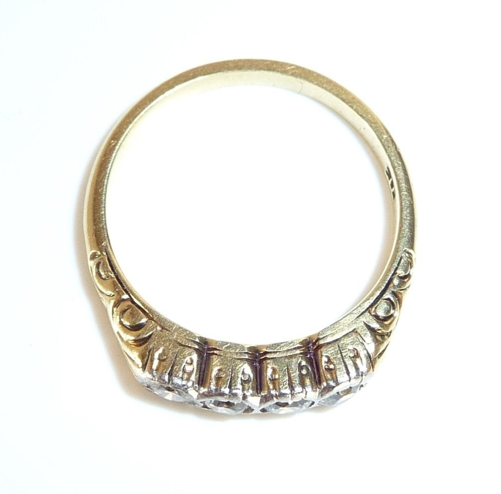 Antiker Ring, gearbeitet in 14 K / 585 Gelbgold. Das Design ist quer zum Finger arrangiert und verzaubert mit seitlichen Ornamenten im Ringkopf. Die 4 Diamanten sind in eine Schicht Weißgold oder Platin eingefasst. Die Diamanten sind im Antiken europäischen Schliff und sind alle identisch groß. Farbe ist ein helles Weiß (F-G), was man sofort an dem brillanten Funkeln sehen kann. Reinheit liegt bei durchschnittlich VS-SI.