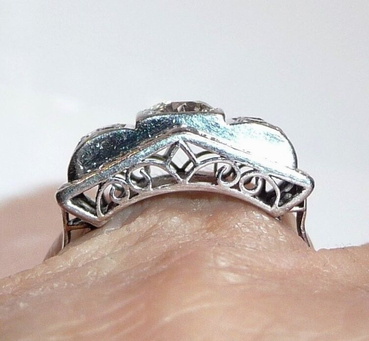 Da der Ring aus dem extrem harten Edelmetall Platin ist, hat er mehr als ein Jahrhundert problemlos überdauert. Die schöne Seitengestaltung mit der Durchbruch-Ornamentik trägt zu dem antiken Zauber bei.