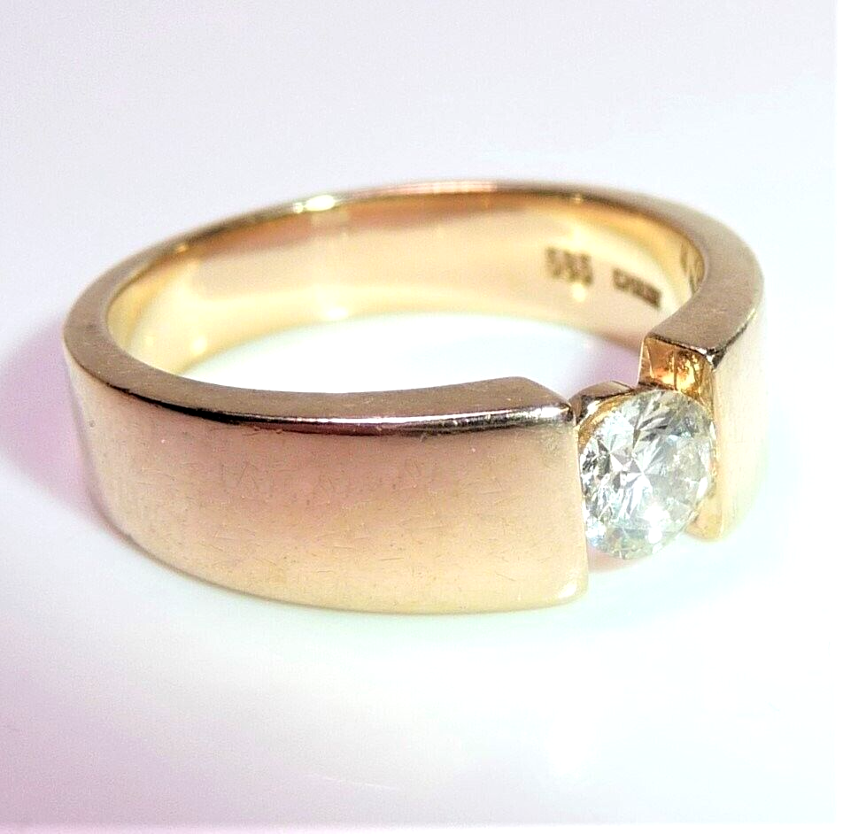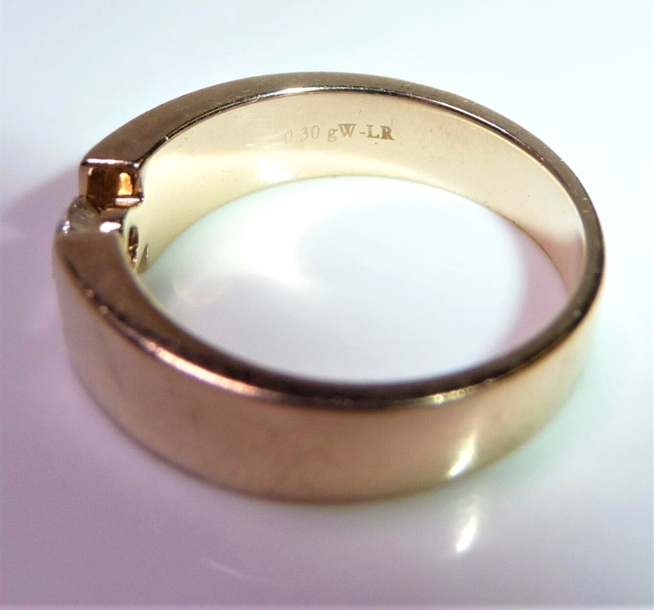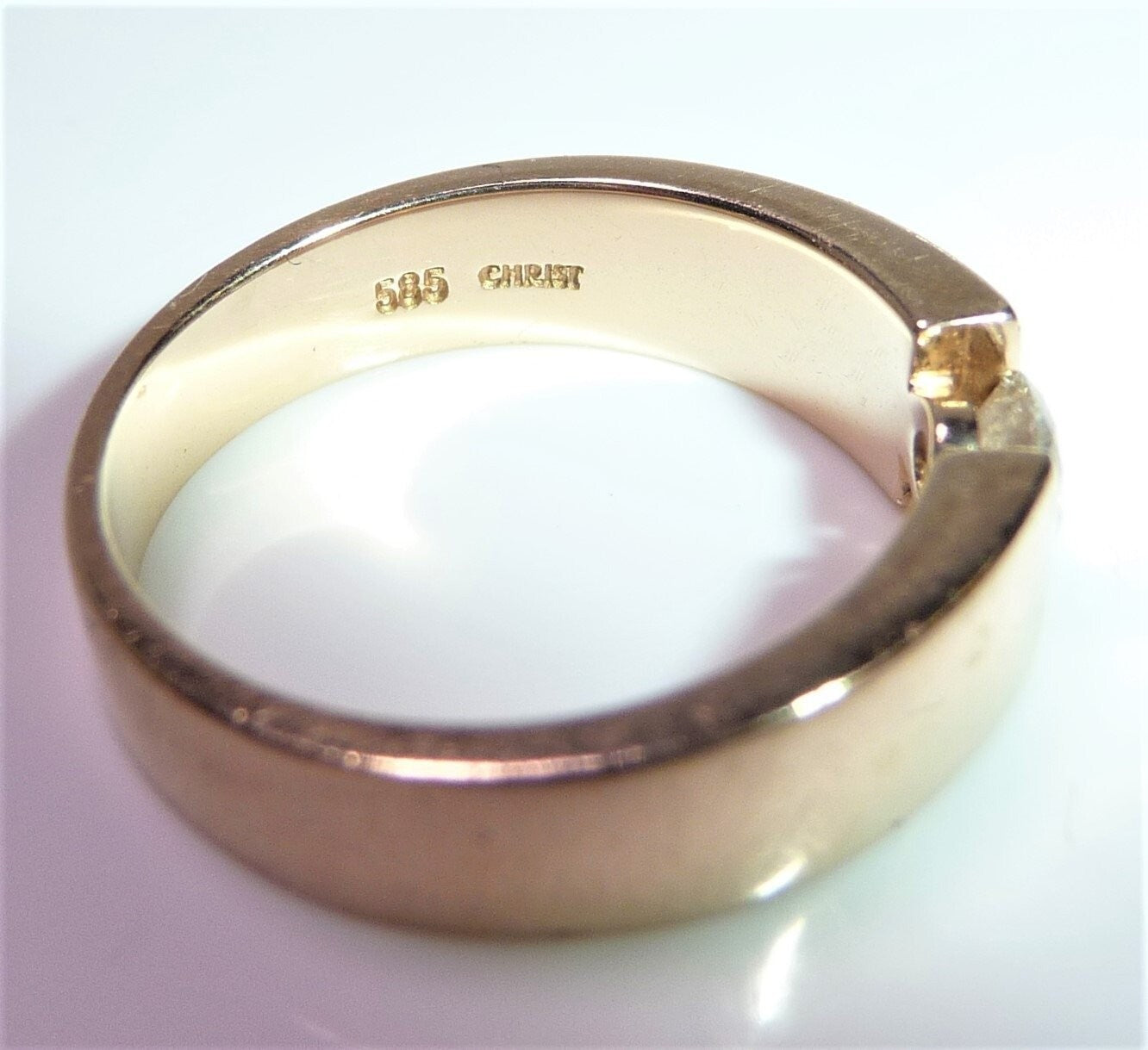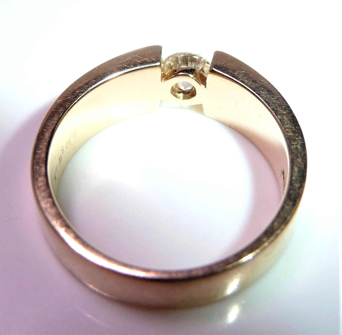 Ring in 585 / 14 kt Gelbgold. Der Ring ist von der Marke "CHRIST" und optisch wie ein Spannring gearbeitet. Dabei wir der Diamant aber von unten gestützt und wird fest gehalten vom breiten Goldband. Eingefasst ist ein Diamant im Brillantschliff von 0.30 ct.. Als Graduierung ist in die Ringschiene "0,30 gW - LR" vom Hersteller per Laser-Gravur eingepunzt. Das steht für: