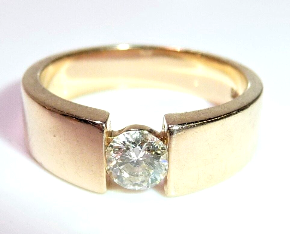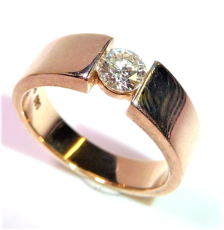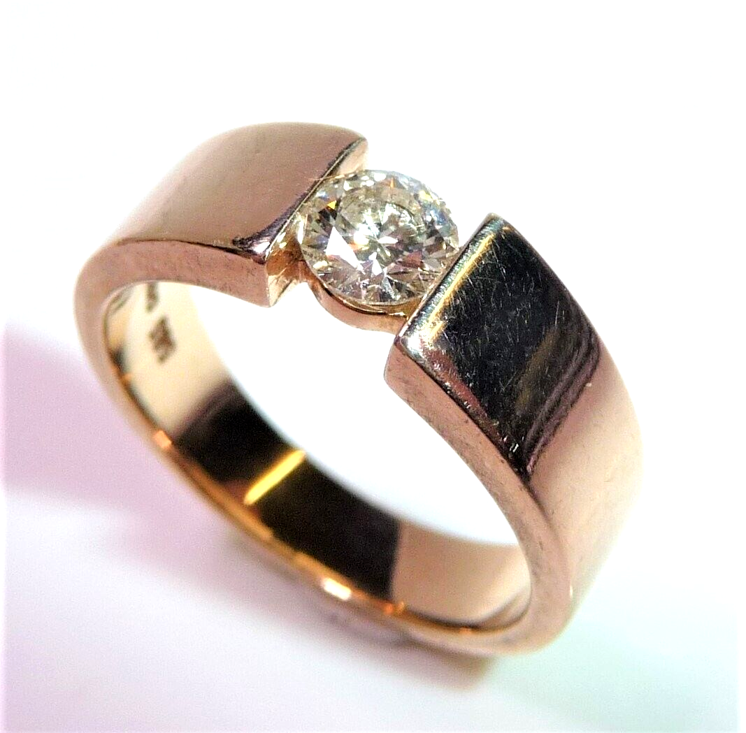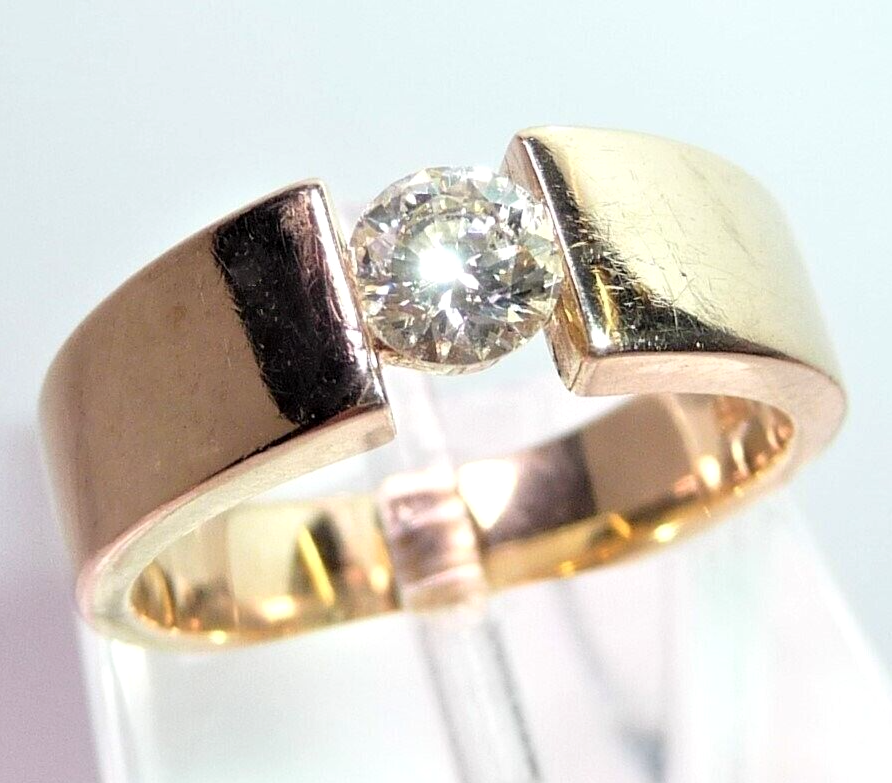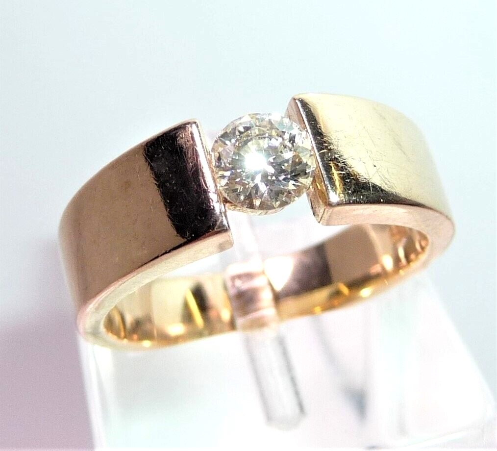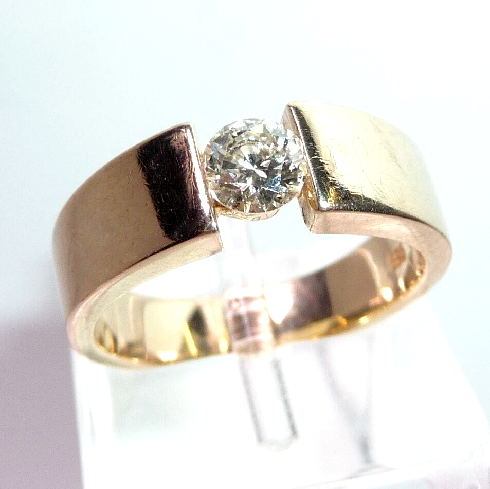 Ring in 585 / 14 kt Gelbgold. Der Ring ist von der Marke "CHRIST" und optisch wie ein Spannring gearbeitet. Dabei wir der Diamant aber von unten gestützt und wird fest gehalten vom breiten Goldband. Eingefasst ist ein Diamant im Brillantschliff von 0.30 ct.. Als Graduierung ist in die Ringschiene "0,30 gW - LR" vom Hersteller per Laser-Gravur eingepunzt. Das steht für: