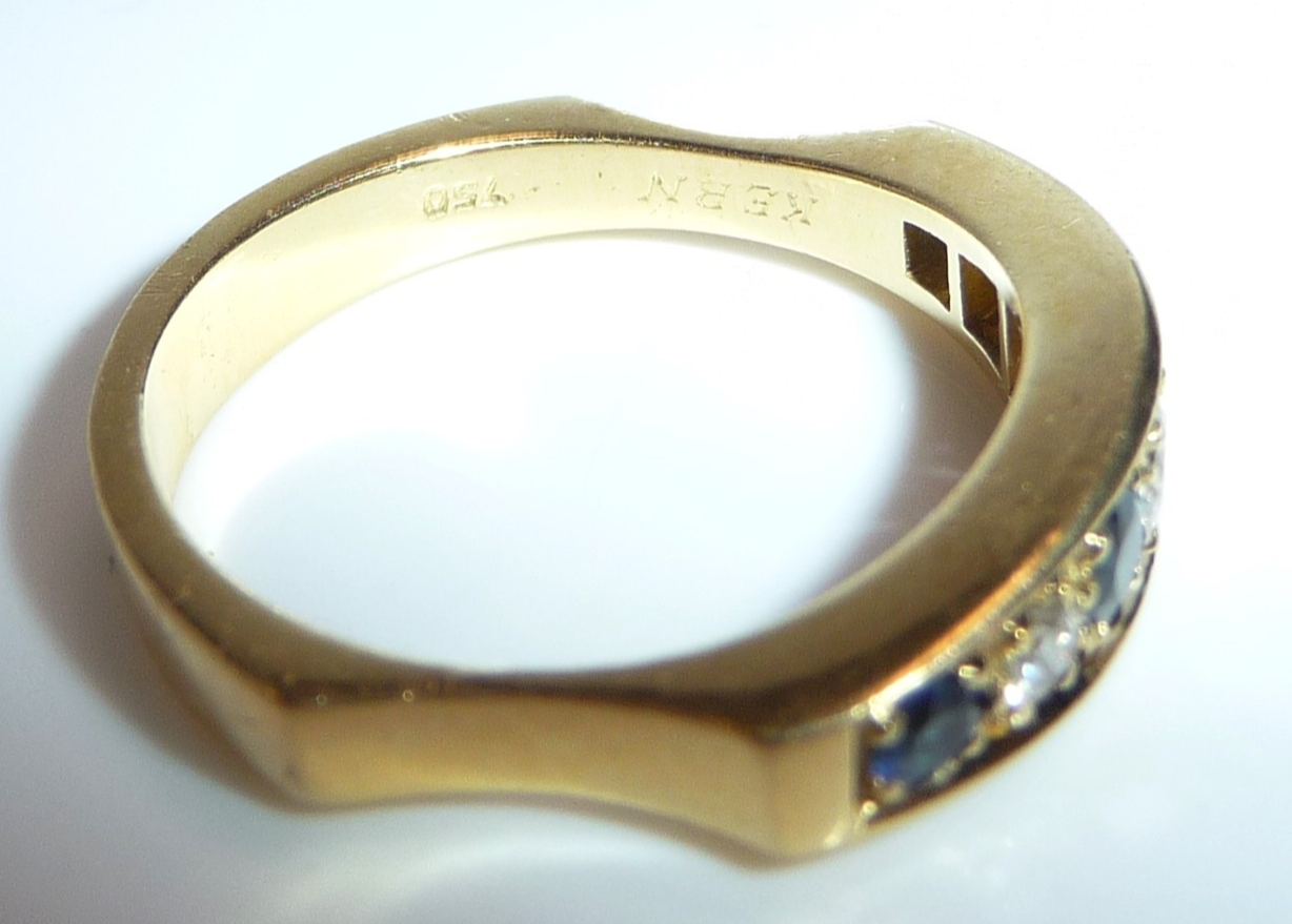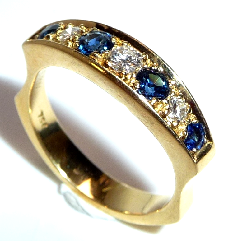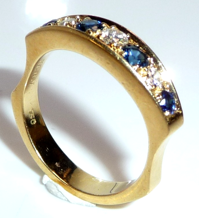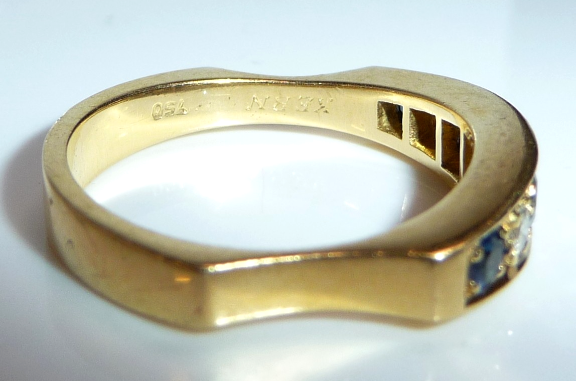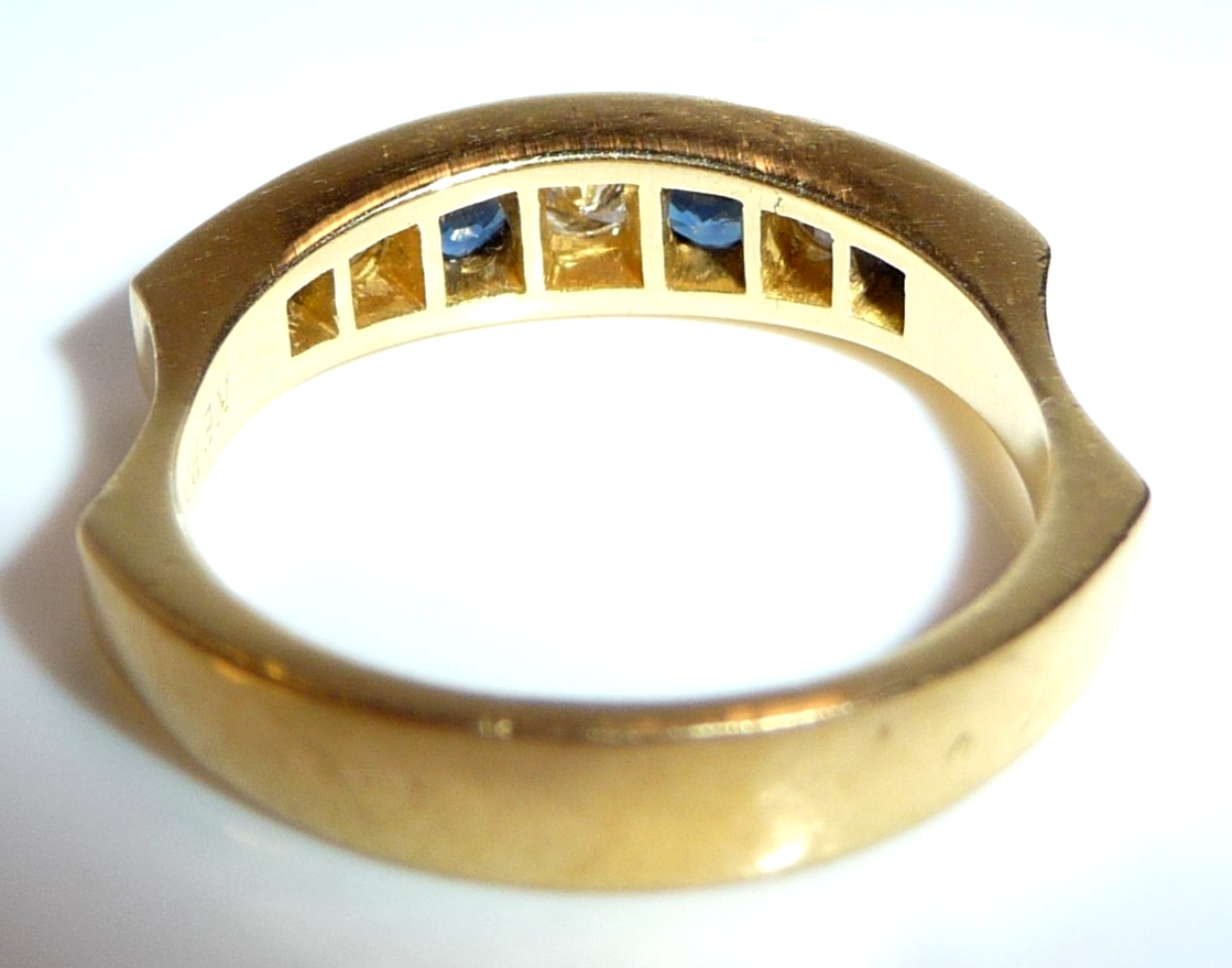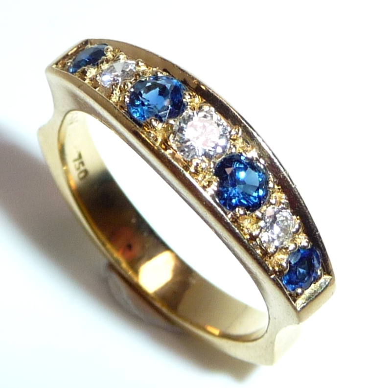 Ring in 750 / 18 K Gelbgold. Das Design des Ringes ist quer über den Finger arrangiert. Im Wechsel sind Saphire und Diamanten eingefasst. Zum Zentrum hin werden die Edelsteine größer. Insgesamt sind 3 Diamanten im Brillantschliff von total 0.20 ct. (F/VS) eingefasst. Dazwischen sind 4 Saphire von total 0.30 ct. eingefasst. Der Ring hat eine seitliche Taillierung, die das Tragen sehr angenehm macht.