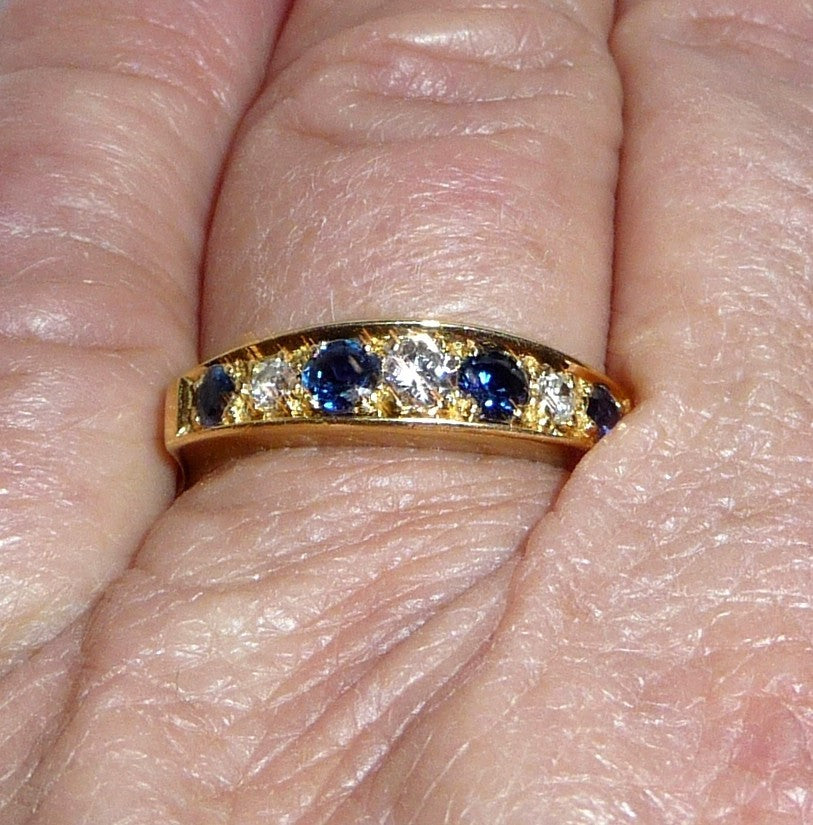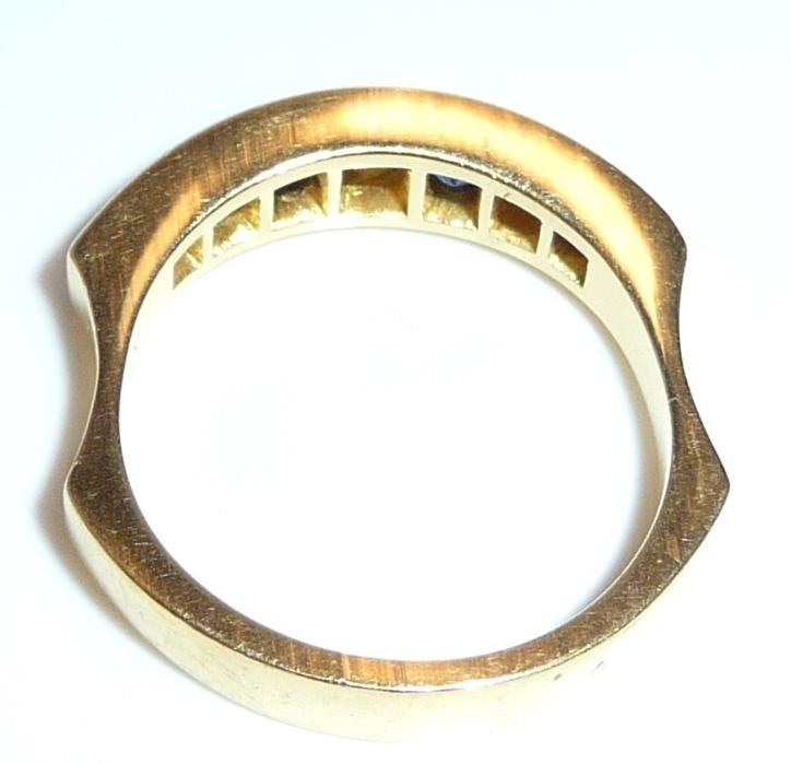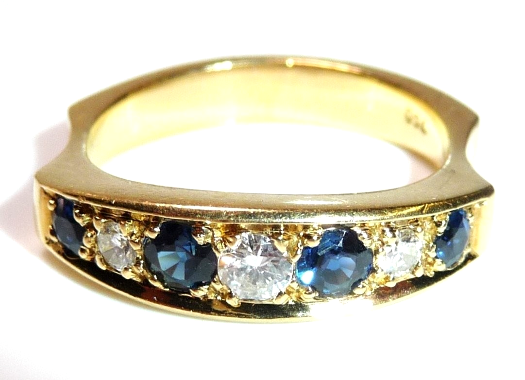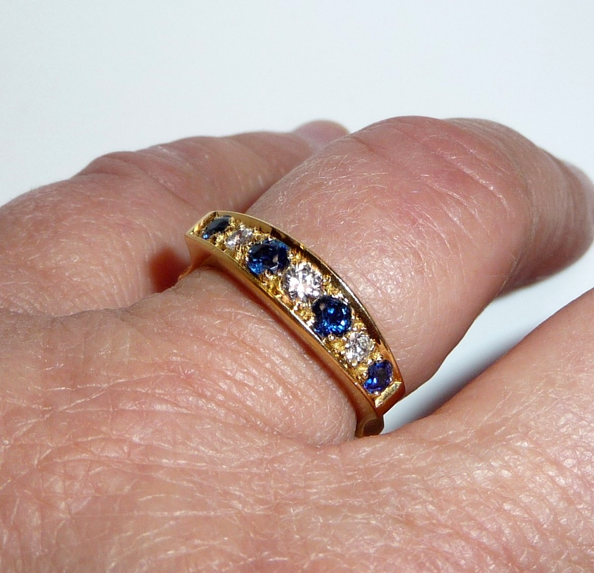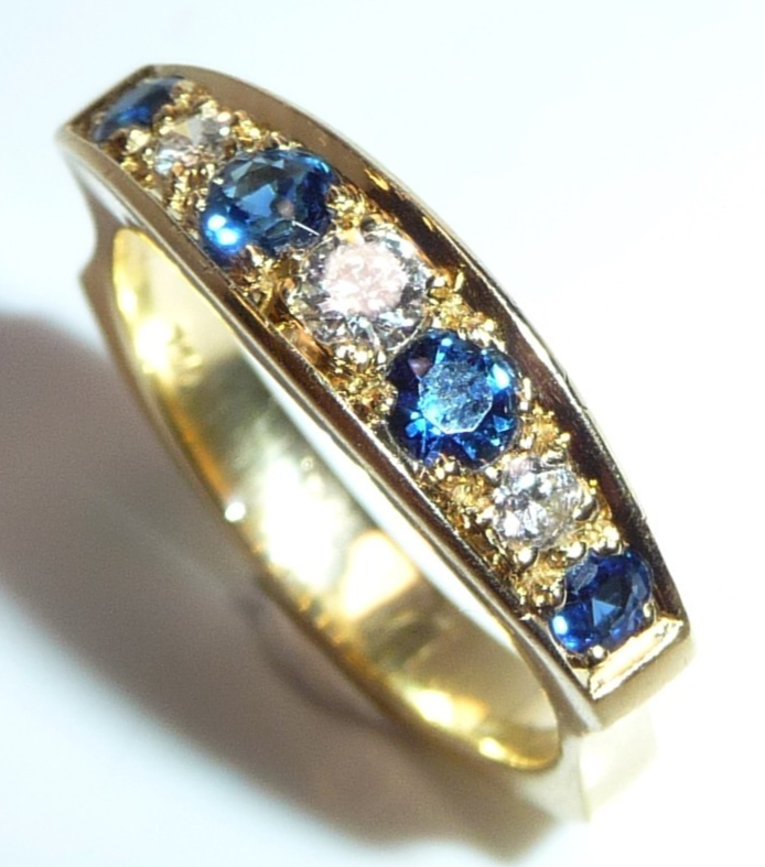 Ring in 750 / 18 K Gelbgold. Das Design des Ringes ist quer über den Finger arrangiert. Im Wechsel sind Saphire und Diamanten eingefasst. Zum Zentrum hin werden die Edelsteine größer. Insgesamt sind 3 Diamanten im Brillantschliff von total 0.20 ct. (F/VS) eingefasst. Dazwischen sind 4 Saphire von total 0.30 ct. eingefasst. Der Ring hat eine seitliche Taillierung, die das Tragen sehr angenehm macht.