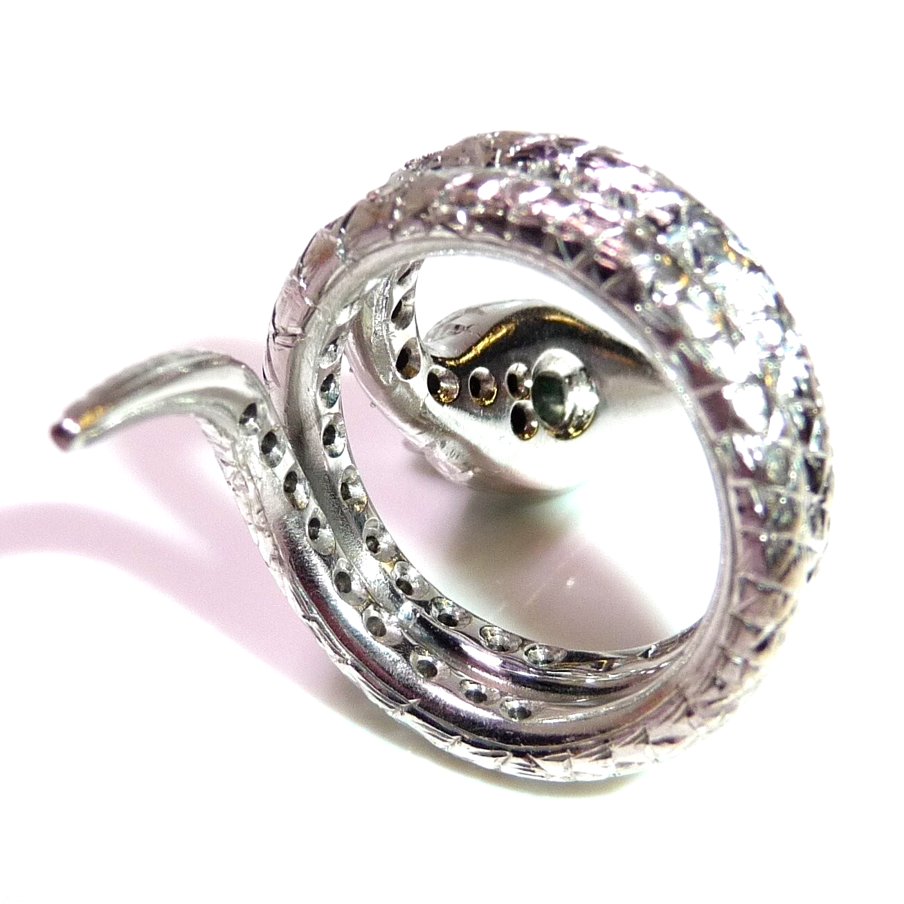 Kreativer Ring in 750 / 18 K Weißgold. Der Ring ist eine exklusive Goldschmiede-Arbeit von Hand. Der Ring formt eine Schlange, die sich etwa 2,5 x um den Finger wickelt und im oberen Bereich den Kopf und den Schwanz abspreizt. Die Schlange ist aus einem Stück geformt und extrem massiv gearbeitet. Der Körper ist rundum vollständig mit Gravuren, welche die Schlangenhaut imitieren, gestaltet. Auf dem Kopf ist ein Solitär-Diamanten im Brillantschliff von ca. 0.35 ct. erhaben in Krappen eingefasst. Der Diamant mit den Maßen 4,4 mm Durchmesser und 2,8 mm Tiefe ist extrem rein (VVS - IF) und hat eine exzellente Farbe (F-D).