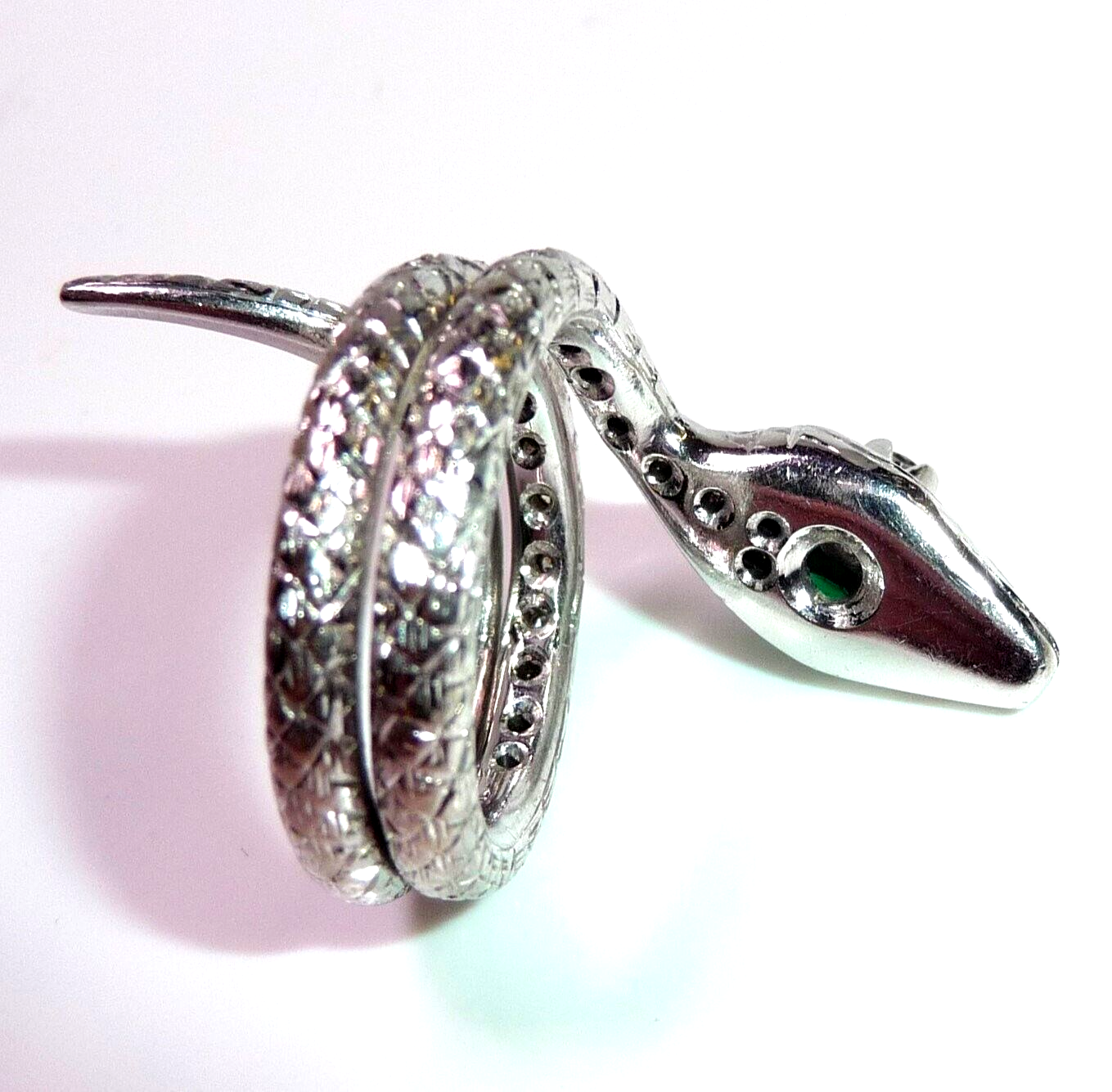In den Augen hat die Schlange zwei Smaragde im Marquise-Schliff von zusammen ca. 0.30 ct. in feinstem frischen Grün.