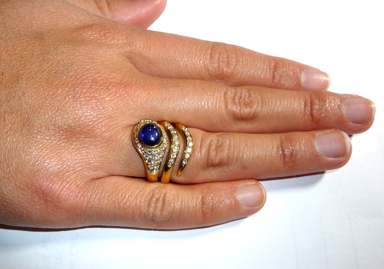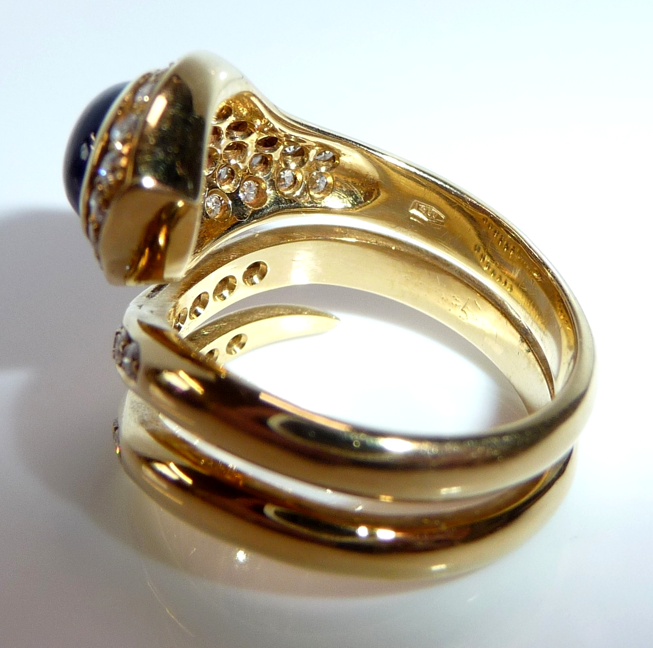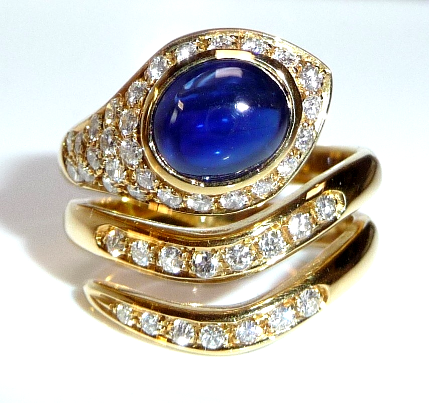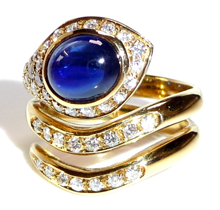 Star des edlen Arrangements ist der große mittelblaue Saphir im Cabochon-Schliff, der den Kopf der Schlange bildet. Der Saphir-Cabochon ist von erlesener Qualität mit spiegelblanker Oberfläche und nahezu augenreiner Transparenz. Der Saphir mit den Maßen 8,2 x 7,2 mm mit einer Tiefe von 4 mm hat 2.50 ct.